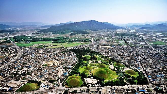 | ▲ 경주시가지 남측 옛 서라벌이다. 바로 앞에 대릉원이, 그 왼편으로 첨성대와 월성이 보인다. 멀리 남산이 우뚝하다. 고려 때 읍성을 쌓으며 이곳을 침범하지 않으려 애쓴 흔적이 역력하다. |