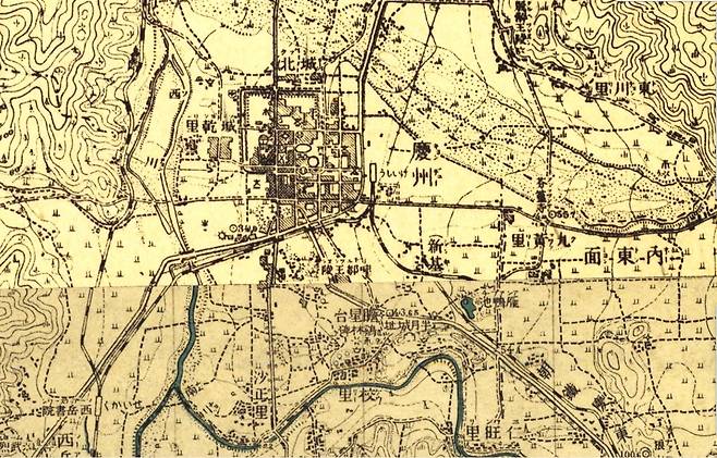 | ▲ 경주(1930년대) 남천과 북천 사이, 옛 서라벌이 사라져 휑한 논밭으로 남았다. 경주읍성의 윤곽이 그나마 남아있고, 지금과는 판이하게 다른 철길(朝鐵慶東線)이 남서쪽에서 올라와 남동쪽으로 빠지고 있다. |