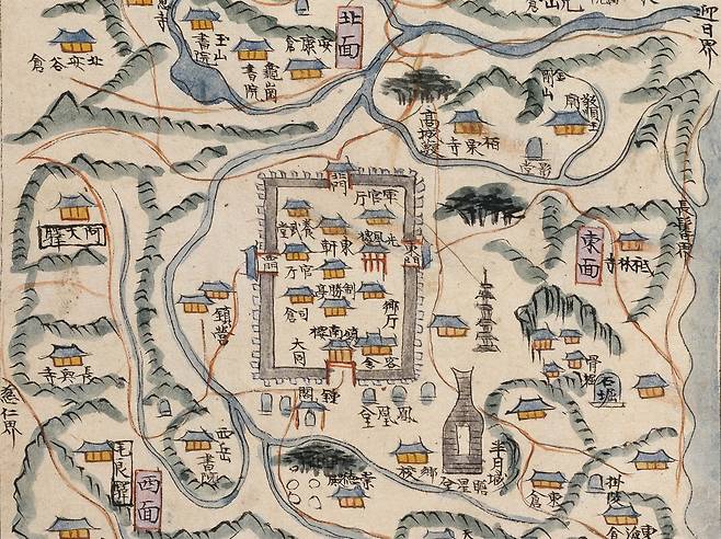 | ▲ 경주부(지승(地乘)_부분) 1770년대~1780년대 사이 그려진 옛 지도 지승의 경주부. 네모난 읍성에 관청이 빼곡하다. 남문 밖에 우스꽝스럽게 그려진 첨성대가 보이고, 그 옆으로 '반월성과 석굴'을 표현하였다. 남문 바로 아래 '종각'에 성덕대왕신종을 걸어 시각을 알리는 종으로 사용했다. |
