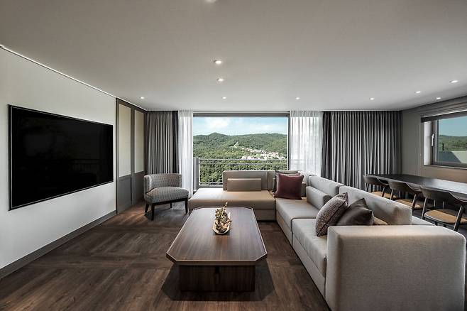 K전통미가 스며든 것도 강점이다. 객실 디자인은 한국의 전통 미술품인 '달항아리'와 '부채'가 모티브다. 현대적인 인테리어에 접목해 고급스러우면서도 편안한 분위기로 연출됐다는 평가. 풍요와 복을 상징하는 달항아리의 유려한 곡선과 백자의 은은한 색감, 한국의 멋과 여유를 담은 부채의 섬세한 디자인이 객실 전체 분위기를 품격 있게 연출한다. 방점은 뷰가 찍어준다. 8층 높이에서 조망하는 파노라마 자연경관은 탁 트인 힐링감을 선사한다.