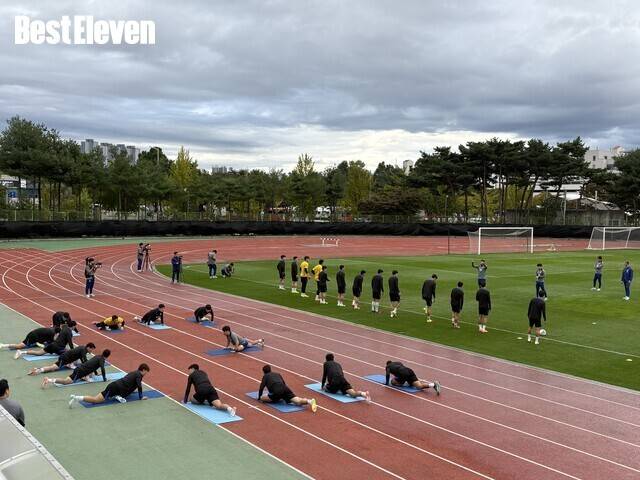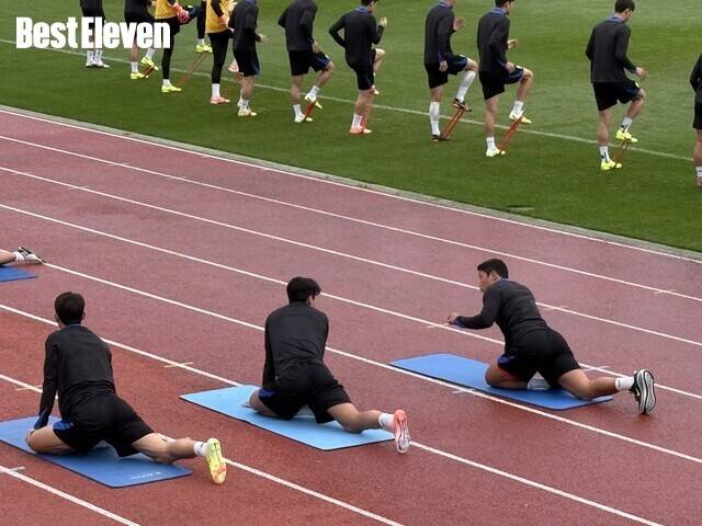 오후 4시를 조금 넘겨 훈련이 시작됐다. 다행히 부상 낙오자 없이 26명 전원이 훈련에 참가했다. 브라질전에서 45분 이상을 소화한 선수들 11명(조현우, 손흥민, 김민재, 설영우, 조유민, 이재성, 김주성, 이태석, 이강인, 황인범, 백승호)과 황희찬은 트랙 위에 매트를 깔고 근육을 풀어주는 워밍업으로 훈련을 시작했다.