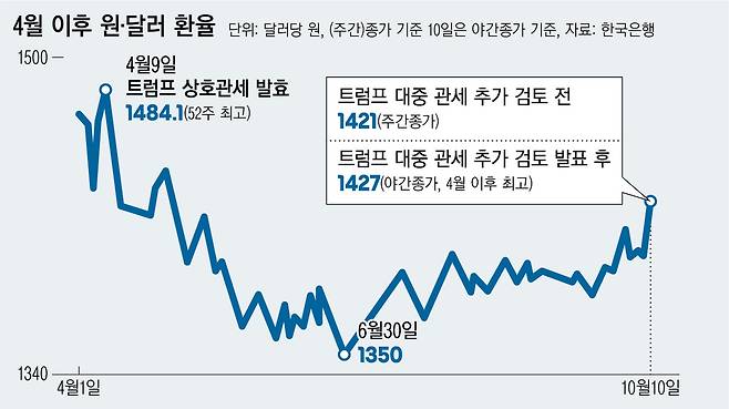 국내 금융시장도 직격탄을 맞았다. 원·달러 환율은 트럼프 발언이 전해진 11일(한국시간) 새벽 시간 전날보다 27원 오른 달러당 1427원에 야간거래를 마쳤다. 주간·야간거래를 합친 종가 기준으로 지난 4월29일(1437.3원) 이후 최고치다. 야간거래에선 한때 1432원까지 치솟기도 했다. 코스피200 야간 선물도 3.99% 하락하며 폭락세를 보였다.