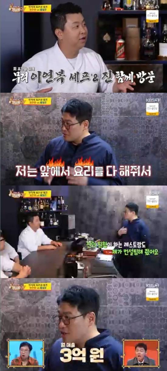 정호영은 배재훈의 월 매출을 듣고 놀라며 "하루 매출 천만원씩?"이라고 물었다. 배재훈은 "형님은 못 찍으시냐"고 정호영을 도발했다.