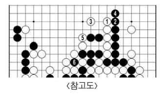 백74를 젖힐 땐 아래 넉 점을 잡힐 각오를 했다. 백80, 82로 오른쪽에 집을 만들 생각이다. 흑은 잡을 것 다 잡고 위쪽에서도 83으로 넉넉하고 편하게 벌려 자리를 잡으니 아쉬울 게 하나도 없다. 인공지능 카타고가 보기엔 <참고도>처럼 백1로 살리고 두느니만 못했다.