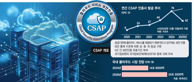CSAP는 정부 및 공공 기관에 클라우드 서비스를 제공하기 위해 요구되는 보안 인증이다. 2020년부터 지난해까지 연간 발급 건수는 매년 증가해온 만큼 CSAP 발급 감소세는 이례적이라는 분석이다. 특히 클라우드 시장은 가파르게 커질 것으로 점쳐지는 상황이다. 한국IDC에 따르면 국내 클라우드 시장 규모는 2024년 14조6000억 원에서 2028년 24조5000억 원으로 성장할 것으로 전망됐다.