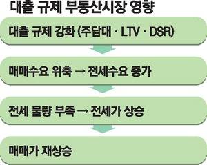 문제는 이러한 규제가 전세가격을 밀어 올릴 수 있다는 점이다. 전세가가 오르면 매매가격이 뒤따르는 경향이 있어 오히려 주택시장 전반에 불안을 키울 수 있다는 우려가 제기된다. 대출 한도가 줄면 집을 사려던 실수요가 전세로 이동하면서 전세 수요가 늘고 자연스럽게 전세가격이 상승하는 구조다.