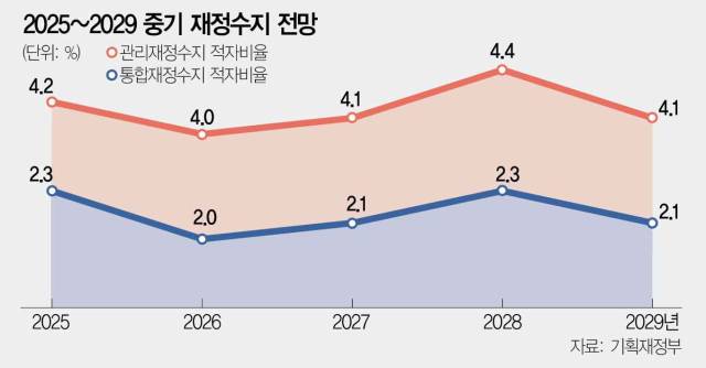 12일 서울경제신문 취재를 종합하면 기획재정부는 최근 재정정책국을 중심으로 현행 재정준칙을 대체할 새로운 기준을 마련하는 실무 작업에 착수했다. 현행 재정준칙은 GDP 대비 관리재정수지 적자를 3% 이내로 제한하도록 규정돼 있다. 관리재정수지는 정부 총수입에서 총지출을 뺀 통합재정수지에서 4대 사회보장성 기금(국민연금·사학연금·산재보험·고용보험기금)을 제외한 수치다. 정부의 실제 재정 상황을 보여주는 순 재정지표로 볼 수 있다. 실제 지난해 관리재정수지 적자는 104조 8000억 원으로 통합재정수지 적자(43조 5000억 원)보다 적자 폭이 더 컸다. GDP와 비교해보면 2025~2029년 관리재정수지 적자 비율은 향후 5년간 평균 4% 초반으로 예상돼 현행 재정준칙을 지키기가 불가능하다.