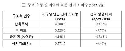 2022년 기준 주택 유형에 따라 전기 소비량을 구분해보면 단독주책의 경우 가구당 전기 소비량이 4000.5kWh로 가장 많았다. 아파트는 3328.0kWh였다. 농촌 군지역의 경우 4148.4kWh로 시지역(도시) 3371.5kWh에 비해 더 많은 전기를 소비하는 것으로 나타났다. 저소득층이 주로 거주하는 단독주택의 경우 전국 가구 전기소비량(3125kWh) 대비 13.3% 가량 많은 전기를 사용했다. 단열이 취약한 주택이 비자발적으로 전기 소비하고 있다는 분석이다. 도시가스 등 효율적 난방 인프라가 부족한 시골의 경우 전기 난방에 의존할 수 밖에 없다.