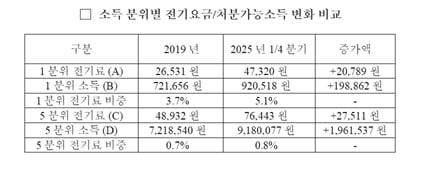 소득 하위 20% 가구가 낸 전기요금은 지난 1분기 처분가능소득(92만520원)의 5.1% 수준이었다. 5년 전인 3.7%에 비해 부담이 1.4%포인트 커졌다. 상위 20% 가구는 가처분소득(918만770원)의 0.8%을 전기요금으로 내 0.1%포인트만 부담이 커지는 데 그쳤다. 곽 의원은 "소득 1분위 가구의 경우 5분위 가구에 비해 압도적으로 에너지 빈곤 상태에 처해있는 것"이라고 분석했다.