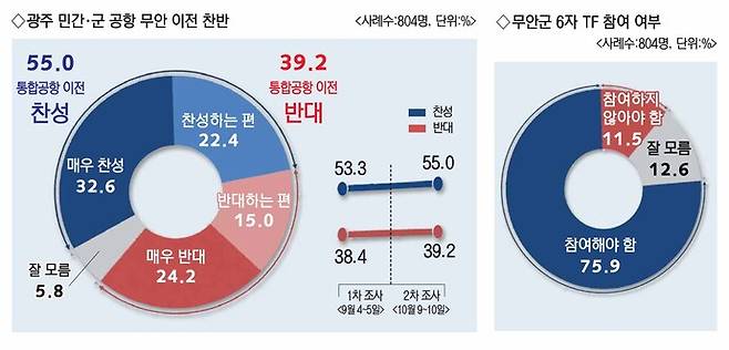 먼저 '민간·군공항에 대한 의견'을 조사한 결과를 보면 '광주 민간·군 공항의 무안 통합 이전'에 대해 '찬성한다'는 의견이 55.0%로 과반을 넘었다. 이 중 '매우 찬성'이 32.6%, '찬성하는 편'이 22.4%를 차지했다. 반면 '반대한다'는 의견은 39.2%로, 이 가운데 '매우 반대'는 24.2%, '반대하는 편'은 15.0%로 나타났다. '잘 모름' 응답은 5.8%였다.