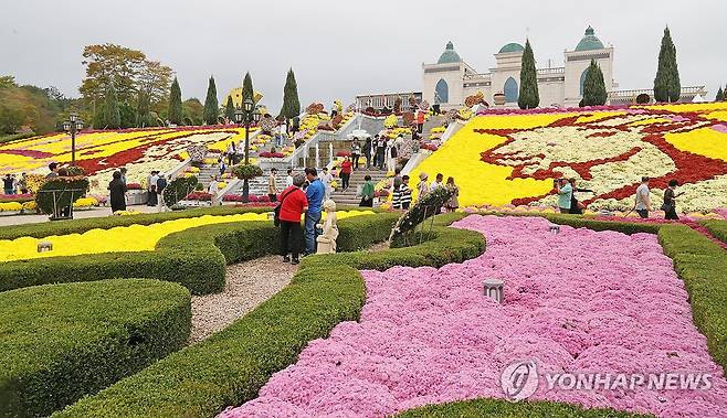 (임실=연합뉴스) 12일 전북 임실군 임실치즈테마파크에서 폐막한 '2025 임실N치즈축제'에서 행락객들이 천만송이 국화를 관람하고 있다. 2025.10.12 [임실군 제공. 재판매 및 DB 금지]