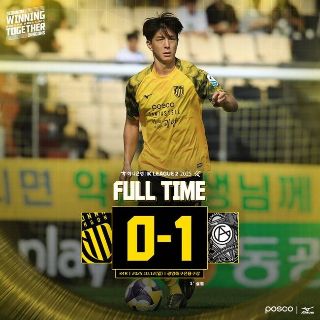 전남드래곤즈가 10월 12일 일요일 오후 2시 광양축구전용구장에서 열린 하나은행 K리그2 2025 34라운드 안산그리너스와의 홈경기에서 0-1로 패하며 연승행진을 3연승에서 끝냈다.