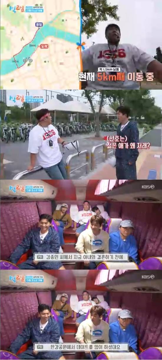 1등으로 도착한 김종민은 예상과 달리 문세윤보다 유선호가 늦어지자 "젊은 애가 왜 저래. 왜 못 따라와"라고 의아해 했다.