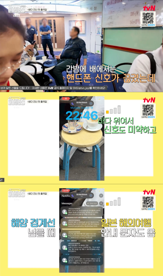 장나라는 "남편이 전화가 안돼서 당황이 됐다"고 밝히며 배 안에서의 어려움을 토로했다. 배에서 신호가 미약했던 탓에 잠시나마 남편과 연락이 잘 닿지 않았던 것. 특히 해양 경계선을 넘을 때 일본 해외여행 안내 문자까지 도착했다고 언급해, 통신이 끊겼던 순간이 단순한 단절이 아니었음을 짐작게 했다.