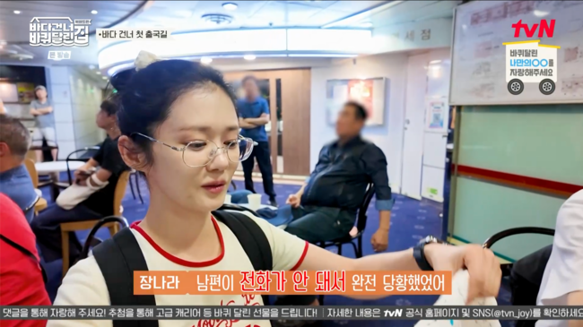 장나라는 "남편이 전화가 안돼서 당황이 됐다"고 밝히며 배 안에서의 어려움을 토로했다.
