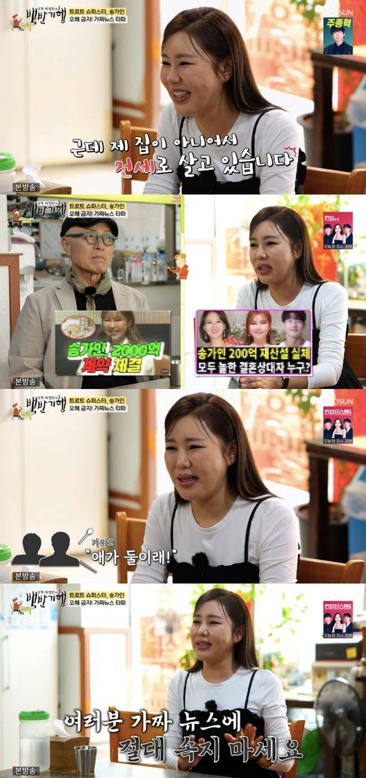 이에 송가인은 "사람들이 그렇게 생각하시는데 유튜브에 가짜 뉴스가 나온다. 저는 이미 건물을 산 사람이더라. 근데 그만큼 못 벌었다"라며 200억 재산설과 건물주에 대한 가짜뉴스에 대해 해명했다.