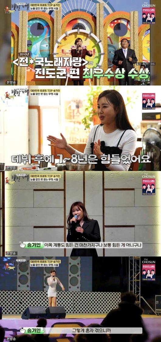 데뷔 초, 한 달에 스케줄 3~4건이 전부였던 송가인은 “제가 트로트 시작한지 이제 7~8년 되는 것 같은데 이쪽 계통도 힘든 건 마찬가지구나. 보통 힘든 게 아니구나. 의상 살 돈도 없어서 정말 인터넷에서 싸게 옷 사서 다니고”라고 힘들었던 무명시절을 떠올렸다.