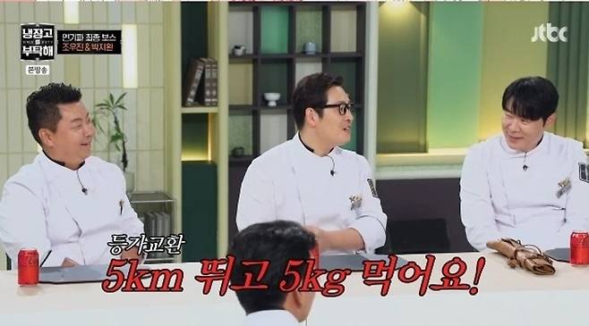 박지환은 정호영 셰프와 JTBC 마라톤 대회에서 만나 인사를 나눈 적도 있다고 밝혔다. 그러자 정호영은 "저 한 달에 160㎞ 뛴다"며 본인도 러너임을 강조했다. 그러자 김풍은 "5㎞ 뛰고, 5㎏ 먹어서 (풍채를) 유지하는 것"이라고 받아쳐 웃음을 자아냈다.