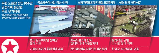 12일 북측 열병식 녹화방송을 살펴보면 김정은 북한 국무위원장은 비가 내리는 가운데 중국·러시아 2인자, 베트남의 최고 권력자와 노동당 창건 80주년 열병식 주석단에 올라 반미·반서방 연대 퍼포먼스를 펼쳤다. 북한은 열병식에서 신형 ICBM 화성-20형을 비롯해 다양한 탄도·순항미사일과 자폭드론, 신형 전차 등 핵·재래식 전력을 두루 선보였다.