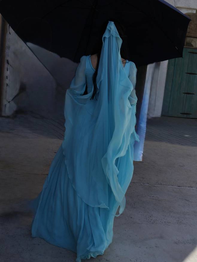 공개된 사진 속 송혜교는 넷플릭스 시리즈 '다 이루어질지니' 촬영 당시 푸른빛 드레스를 입은 '비를 다스리는 정령 지니야'로 변신한 모습이다.