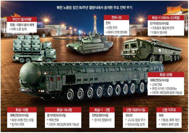 북한의 조선노동당 창건 80주년 열병식은 국제사회에 핵·미사일 기술의 진보를 알린 쇼케이스로 평가된다. 북한은 신형 대륙간탄도미사일(ICBM)과 극초음속 미사일 등 첨단 무기부터 현대화한 재래식 무기에 이르기까지 총 전력을 과시했다. 공개 여부를 두고 가장 큰 관심을 모았던 고체연료 ICBM 화성-20형(추정 사거리 1만5000㎞)의 등장은 미국을 향한 핵 억제력을 완성했다는 김정은 북한 국무위원장의 대외적 선언으로 볼 수 있다.