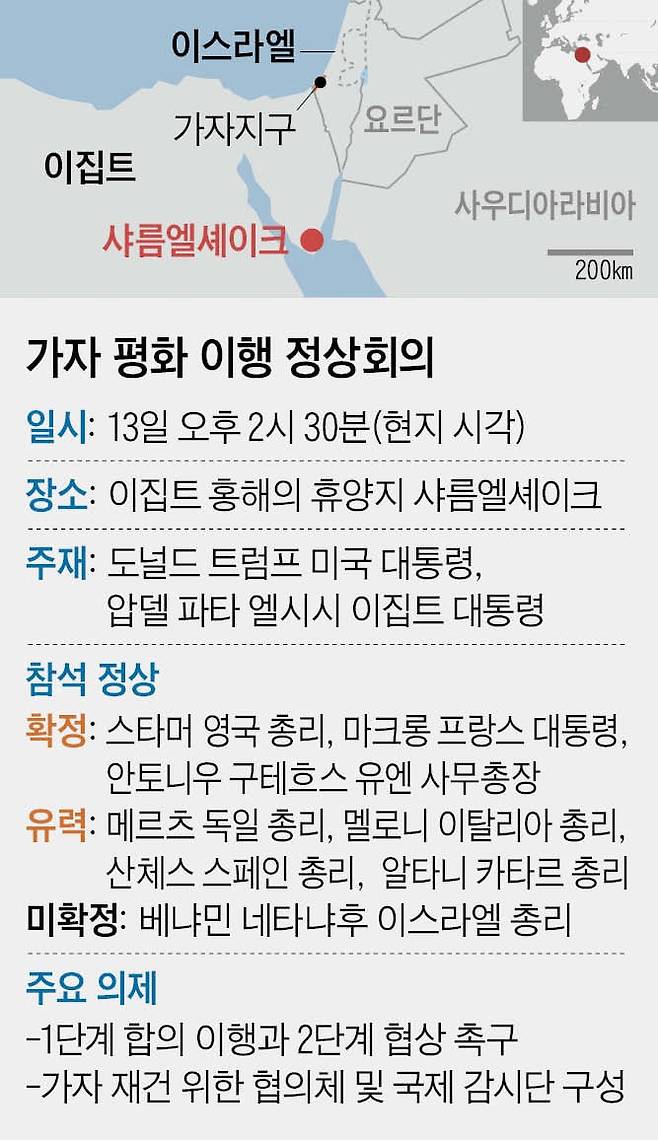 도널드 트럼프 미국 대통령이 주재하는 ‘가자 평화 정상회의(가자 정상회의)’가 13일 이집트 휴양지 샤름엘셰이크에서 합의 서명식과 함께 열린다. 트럼프가 자신의 ‘가자 평화 구상’ 1단계 합의를 축하하고, 그 이행과 2단계 추가 합의를 압박하는 국제 여론 결집 성격의 행사다.
