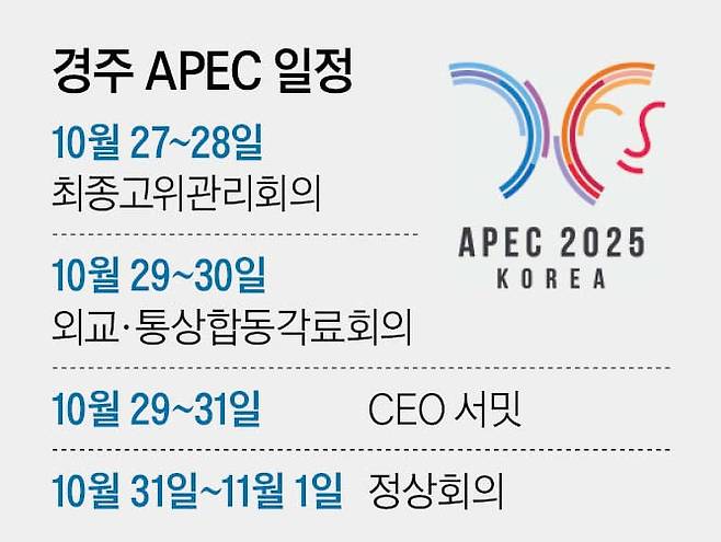 또 정부는 APEC 정상회의 폐막식에서 인공지능(AI) 산업과 인구 구조 변화에 관한 APEC 회원 간 협력 방안을 담은 ‘경주 선언(가칭)’ 채택을 추진 중인데, 미·중 갈등으로 인해 관심도가 떨어지는 문제도 있다. 반대로 미·중 정상회담이 극적으로 경주에서 열릴 경우 오히려 더 주목받을 수 있다는 기대도 있다. 대통령실 관계자는 “트럼프 대통령이 협상력을 높이려는 기술로 대중 관세 관련 발언을 내놓고 있는 것 같다”며 “미·중 간 패권 싸움으로 격화될 것이라고만 생각할 문제는 아니다”라고 했다.