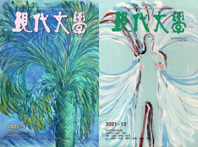 이번 전시에 앞서 그의 야자수 작품이 문예지 ‘현대문학’ 9월호 표지에 실렸다.(왼쪽) 앞서 2021년 12월호에 남편 이 작가의 작품이 실린 데 이어 부부 작가가 나란히 문학잡지 표지를 장식하는 보기 드문 기록을 남기게 됐다.