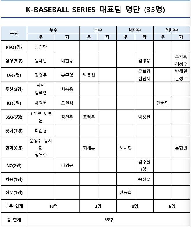 해당 명단을 살펴보면 투수 18명, 포수 3명, 야수 14명 등 총 35명으로 구성됐다.
