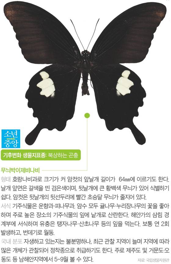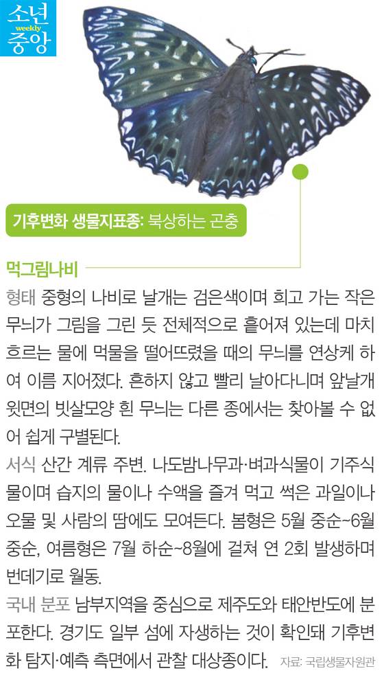 소중 학생기자단은 첫 번째로 기온이 따뜻해지면서 원래 살던 남쪽 지방에서 북쪽으로 서식지를 북상하는 곤충을 만났어요. 먹그림나비와 푸른큰수리팔랑나비는 먹이식물 나도밤나무가 기온 상승으로 북쪽으로 이동하자 먹이를 따라 이동하게 됐죠. 1990년 전남 해남군에서 2004년 전북 완주군으로, 이어 2010년 충남 홍성군에서 2013년 인천 무의도까지 올라온 먹그림나비와 나도밤나무의 여정을 보며 세 사람은 너무 빠른 건 아닌지 걱정했어요.