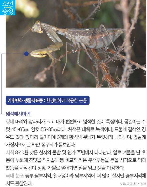두 번째는 환경에 적응한 곤충입니다. 말매미는 온도 상승으로 유충 생존율이 높아지고, 우화시기도 빨라져 개체수가 증가해 2000년대 중반 이후 한반도 전역으로 서식지를 넓혀가고 있어요. 이 연구사는 말매미가 늘며 여름밤에 말매미가 크게 우는 소리를 더 자주 들을 수 있게 됐다고 귀띔했죠. 넓적배사마귀는 따뜻해진 날씨 덕에 활동 시기가 길어진 데다 뭐든 잘 먹는 식성 덕에 적응을 쉽게 하며 서식지를 확장하고 있고요. 과천과학관 생태연못에도 사는 넓적배사마귀는 전시장에서도 직접 만날 수 있어요. 관찰 상자를 들여다보니 넓적배사마귀가 천장에 거꾸로 붙어있었죠.
