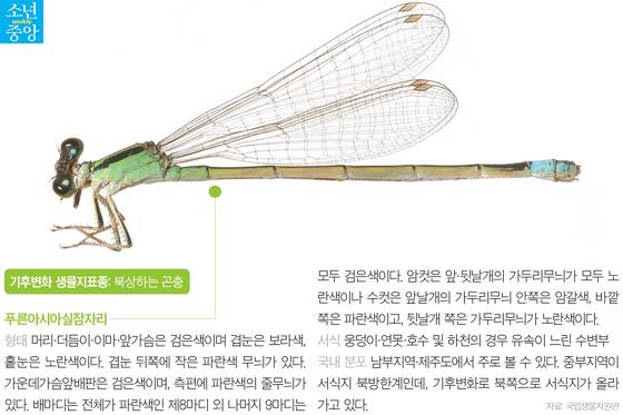 아열대성 곤충인 무늬박이제비나비와 푸른아시아실잠자리는 각각 경상남도와 전라남도에 처음 자리를 잡은 후 따뜻해진 한반도의 기온을 따라 꾸준히 북상하고 있죠. 특히 아프리카·중동 등에 서식하는 푸른아시아실잠자리는 1980년대 전남에서 확인된 후 따뜻해진 한반도의 기온을 따라 북쪽으로 올라와 2020년 경기도 파주에서도 사는 것을 발견했어요. 소중 학생기자단은 푸른아시아실잠자리 서식지 변화 지도와 영상을 눈여겨봤죠.