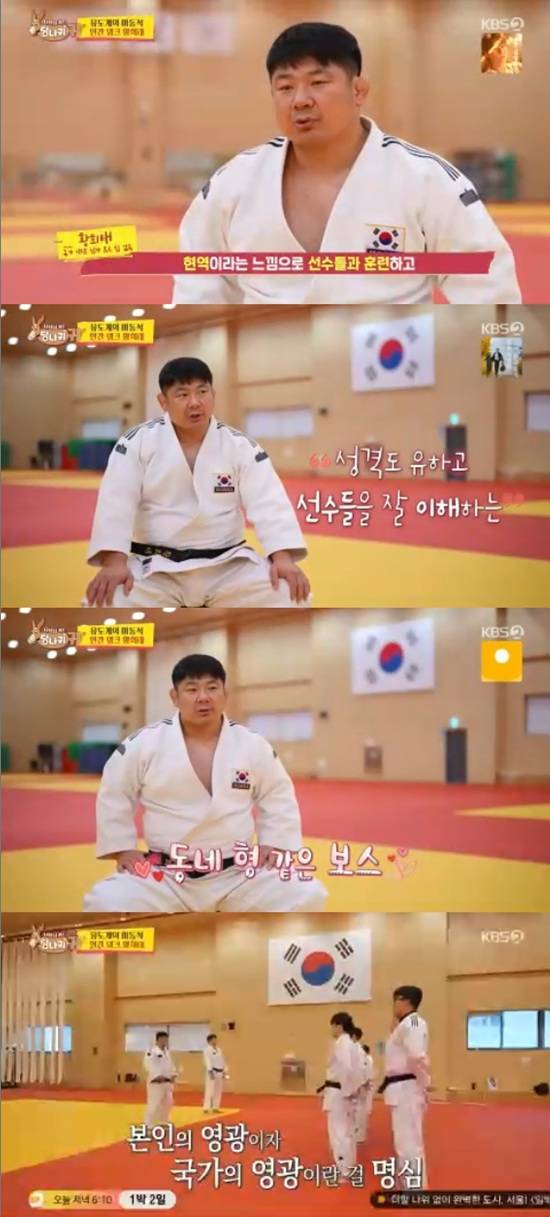 이날 황희태는 18명 유도 남자 국가대표의 수장으로 등장, "저는 현역 느낌으로 선수들과 훈련하고 성격도 유하고 선수들을 잘 이해하는 마음이 통하는 동네 형 같은 보스다"라고 자기소개를 했다.