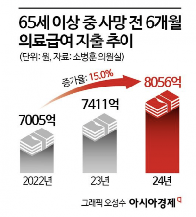 사망 직전 6개월간 의료급여 지출은 2022년 7005억원에서 2024년 8056억원으로 15.0%, 건강보험 지출도 같은 기간 4조1429억원에서 4조4298억원으로 6.9% 증가했다.