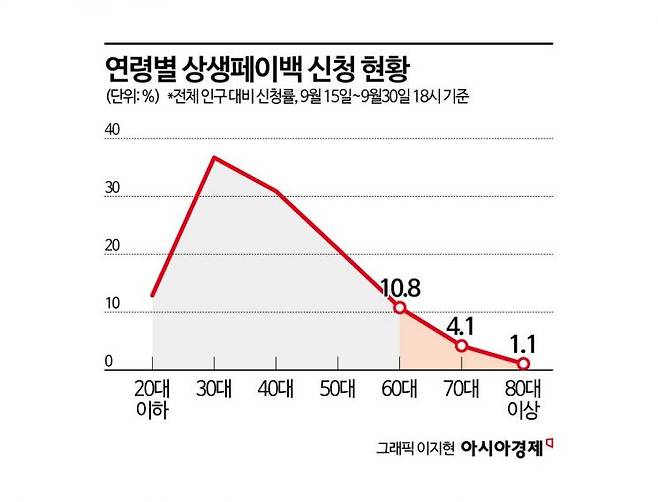 13일 더불어민주당 김원이 의원실이 중소벤처기업부로부터 제공받아 분석한 자료에 따르면 올해 소상공인 매출 증대와 내수 진작을 목표로 시행된 상생페이백의 연령별 전체 인구 대비 신청률은 40대까지 30%대를 웃돌다 60대에서 10.8%로 급감했다. 70대(4.1%)와 80대 이상(1.1%)에선 5%대 아래로 크게 줄어 연령이 높아질수록 신청률이 급감하는 모습을 보였다.