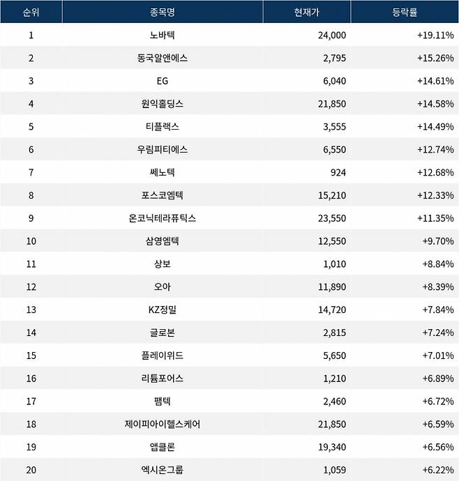 이어 상승률 2위 동국알앤에스(075970)는 현재가 2,795원으로 주가가 15.26% 급등하고 있다. 상승률 3위 EG(037370)는 현재 6,040원으로 14.61% 급등하며 강세를 보이고 있다. 상승률 4위 원익홀딩스(030530)는 14.58% 상승하며 21,850원에 거래되고 있다. 상승률 5위 티플랙스(081150)는 14.49%의 상승세를 타고 3,555원에 거래되고 있다.