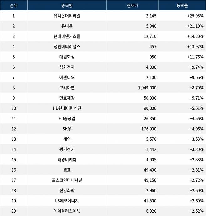 6위 삼화전자(011230)는 현재가 4,000원으로 9.74% 상승 중이다. 7위 아센디오(012170)는 현재가 2,100원으로 9.66% 상승 중이다. 8위 고려아연(010130)은 현재가 1,049,000원으로 8.70% 상승 중이다. 9위 만호제강(001080)은 현재가 50,900원으로 5.71% 상승 중이다. 10위 HD현대마린엔진(071970)은 현재가 90,000원으로 5.51% 상승 중이다.
