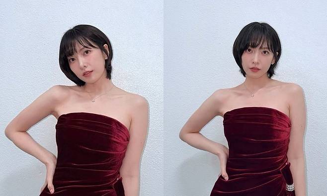 공개된 사진 속 강지영은 숏컷 헤어스타일로 이목을 사로잡았다. 레드톤의 튜브탑 스타일 드레스를 착용한 그는 우아한 어깨라인을 드러내 팬들의 환호성을 이끌었다.