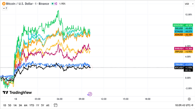솔라나도 8.45% 올랐고 이더리움과 에이다도 각각 8.27%, 8.18% 반등했다.