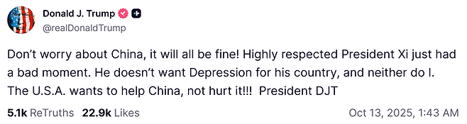 그러면서 “매우 존경받는 시(시진핑) 주석이 잠시 안 좋은 순간을 겪었을 뿐”이라며 “그는 자기 나라가 불황을 겪는 것을 원하지 않고, 나 역시 마찬가지”라고 다.