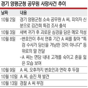 A 씨를 만난 박경호 변호사는 “양평에서 A 씨를 직접 만나서 (메모의) 내용을 확인하고 받았다”며 “이후 8일에 또 만났고, 9일 오후까지 서로 문자를 주고받았다”고 말했다. A 씨는 9일 저녁에서 10일 오전에 숨졌을 것으로 추정된다.