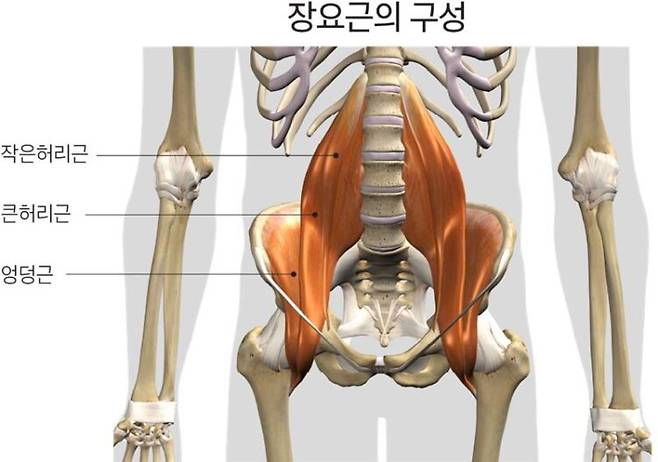 잠시 해부학 지식으로 들어간다. 장요근은 대요근과 소요근, 장골근 셋으로 이루어져 있다. 대요근은 허리뼈(요추)에서 시작해 골반을 이루는 볼기뼈를 지나 넙다리뼈에 붙는다. 장골근은 볼기뼈의 큰 부분인 엉덩뼈를 채우고 아래로 내려오면서 대요근을 만나 장요근을 형성한다. 소요근은 마지막 등뼈와 첫째 허리뼈에 붙어 있는 수직 방향 근섬유에서 시작하는데, 형태가 일정하지 않고, 사람 중 40%에만 존재한다. 소요근이 없는 사람이 더 많은 것이다. 그래서 전문서 중에 장요근을 대요근과 장골근으로 이루어졌다고 설명하는 책이 있다.