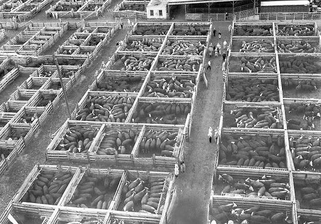 | ▲ 시카고 유니언 도축장 및 운송회사 계류장에서 도축을 기다리는 동물들 운송과 냉장이라는 두 가지 요소는 시카고 일리노이의 축산업 발전에 기여했다 |