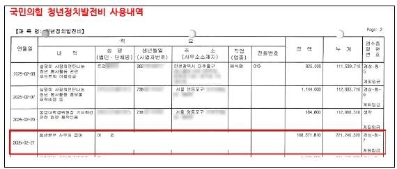 | ▲ 국민의힘 청년정치발전비 사용내역 |