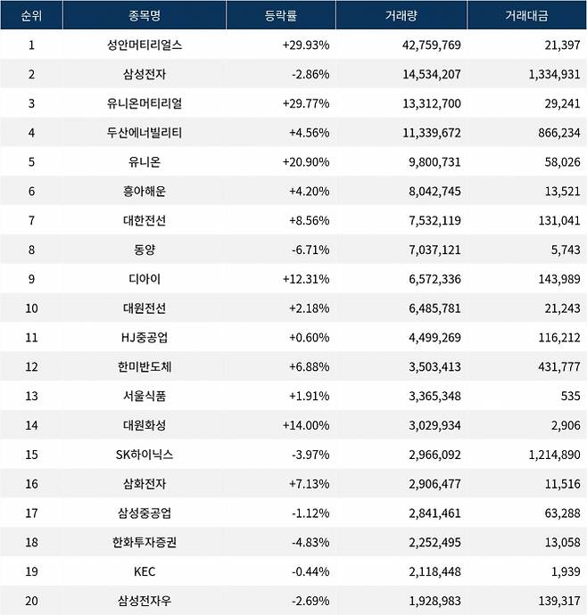 한편, 거래량 상위 20위권 종목들은 HJ중공업(097230) ▲0.60%, 한미반도체(042700) ▲6.88%, 서울식품(004410) ▲1.91%, 대원화성(024890) ▲14.00%, SK하이닉스(000660) ▼3.97%, 삼화전자(011230) ▲7.13%, 삼성중공업(010140) ▼1.12%, 한화투자증권(003530) ▼4.83%, KEC(092220) ▼0.44%, 삼성전자우(005935) ▼2.69% 등의 성적을 기록한다.