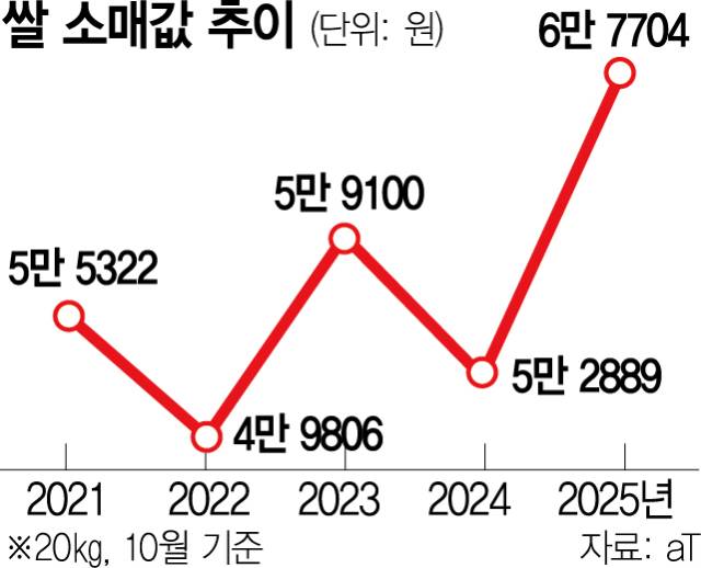 최근 쌀값은 지속적인 상승세를 보이고 있다. 한국농수산식품유통공사(aT) 농산물유통정보(KAMIS)에 따르면 쌀 소매가격은 이달 10일 기준 20㎏에 6만 7351원을 기록해 지난해(5만 2980원)에 비해 27.13%나 뛴 상태다.