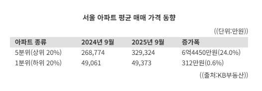 9월 서울 5분위 아파트 평균 매매 가격은 32억9324만원으로 전년 동월 26억8774만원 대비 6억4450만원(24.0%) 상승했다. 반면 9월 서울 1분위 아파트 평균 매매 가격은 4억9373만원으로 전년 동월 4억9061만원 보다 312만원(0.6%) 증가에 그쳤다.