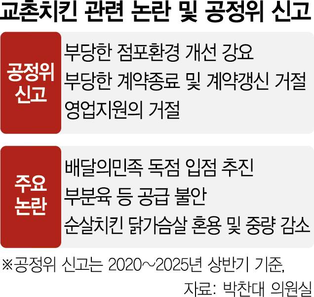 13일 국회 정무위 소속 박찬대 더불어민주당 의원이 공정거래위원회로부터 받은 자료에 따르면 2020년부터 올해 상반기까지 교촌치킨 가맹점의 공정위 신고 9건 중 ‘부당한 점포환경 개선 강요’가 7건으로 가장 많았다.