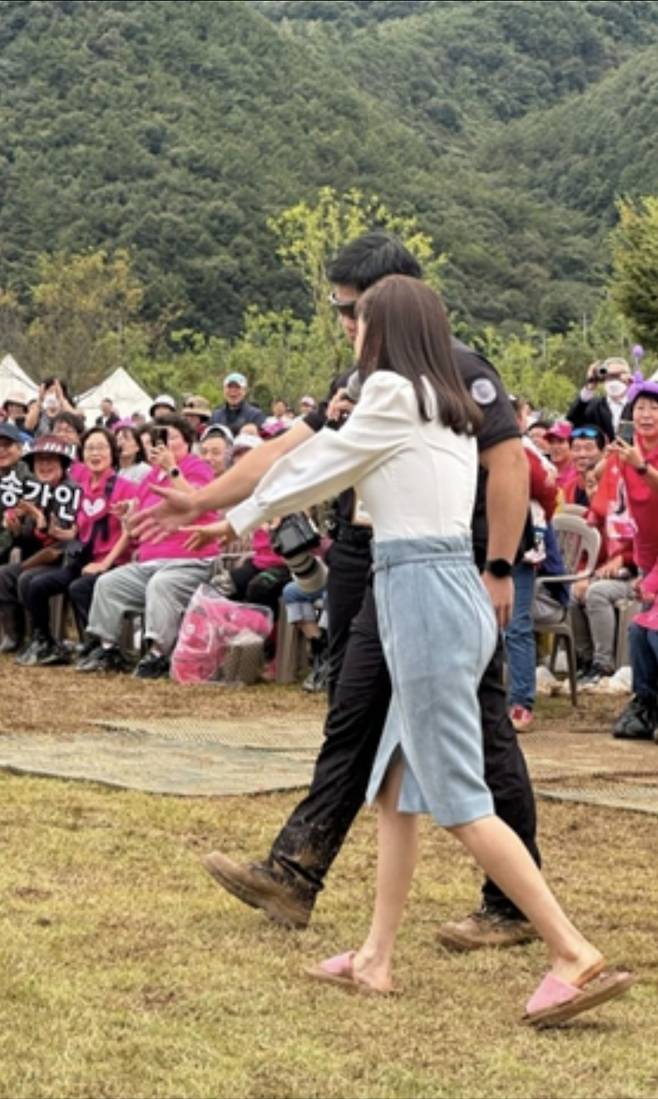 이날 행사장에 도착한 송가인은 전국적으로 내린 비의 영향으로 무대가 진흙탕으로 변한 것을 확인하자 구두를 벗고 슬리퍼를 신은 채 무대에 올랐다. 한 걸음 내디딜 때마다 진흙이 튀는 상황임에도 불구하고, 송가인은 개의치 않은 채 라이브로 무대를 선보여 관객들의 이목을 집중시켰다.