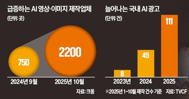 AI 광고 송출도 늘었다. 국내 광고영상 아카이브 TVCF를 운영하는 애드크림에 따르면 공중파·케이블·인터넷 등으로 송출된 생성형 AI 광고는 2023년 8건, 2024년 45건, 2025년(1~10월) 111건으로 매년 늘고 있다. 올해 송출된 국내 전체 광고 건수(약 5300건)를 감안하면 비중이 아직 2% 수준에 불과하지만, 증가세는 뚜렷하다.